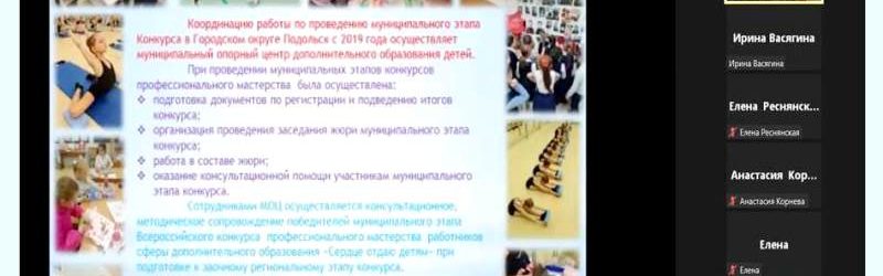 В региональном этапе Всероссийского конкурса профессионального мастерства работников сферы дополнительного образования «Сердце отдаю детям» принимают участие  три педагога дополнительного образования Городского округа Подольск – победители муниципального этапа конкурса: Оксана Александровна Афанасьева (МУ ДО ЦДТ), Елена Сергеевна Иванова (МОУ СОШ №12), Елена Евгеньевна Вдовина (МОУ СОШ №20). Педагоги уже представили на суд жюри публичное выступление «Моя …
