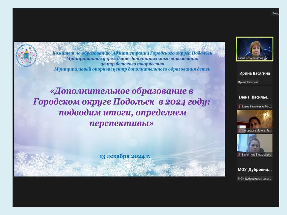 В соответствии с планом работы на 2024 год муниципальный опорный центр дополнительного образования детей 13 декабря провёл в онлайн формате итоговую муниципальную конференцию «Дополнительное образование в Городском округе Подольск в 2024 году: подводим итоги, определяем перспективы». Цель конференции: подведение итогов деятельности в сфере дополнительного образования в Г.о. Подольск в 2024 году; трансляция педагогического опыта по реализации дополнительных общеобразовательных общеразвивающих программ.