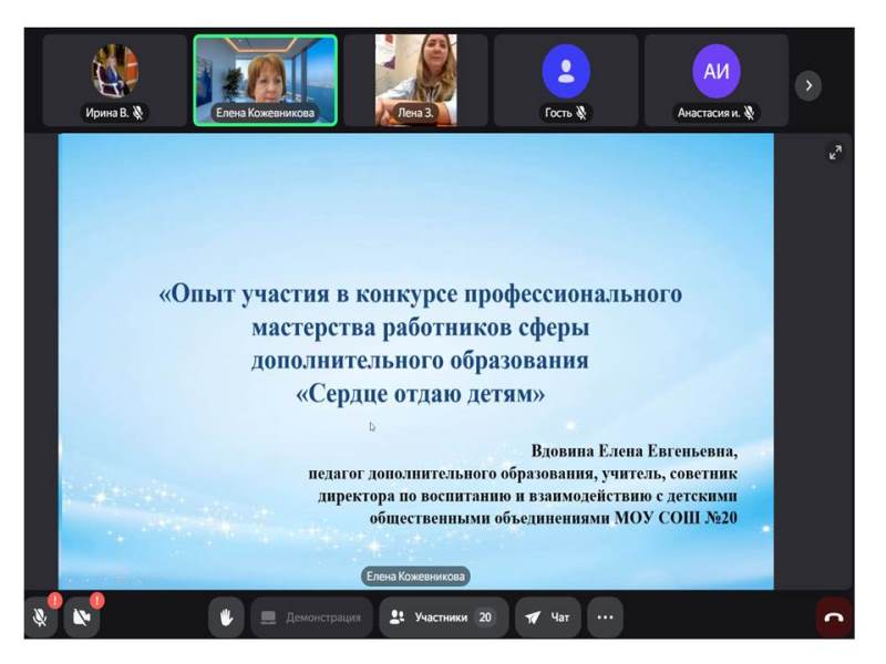 Доклады выступающих были посвящены: особенностям реализации социального заказа в части дополнительных общеобразовательных общеразвивающих программ (Е.А. Кожевникова, методист, руководитель МОЦ ), итогам реализации формы наставничества «педагог-педагог» в условиях дополнительного образования (И.Р. Васягина, методист МОЦ), опыту участия в конкурсе профессионального мастерства работников сферы дополнительного образования «Сердце отдаю детям» (Е.Е. Вдовина, педагог дополнительного образования, учитель, советник директора по воспитанию и взаимодействию с детскими общественными объединениями МОУ СОШ № 20).