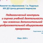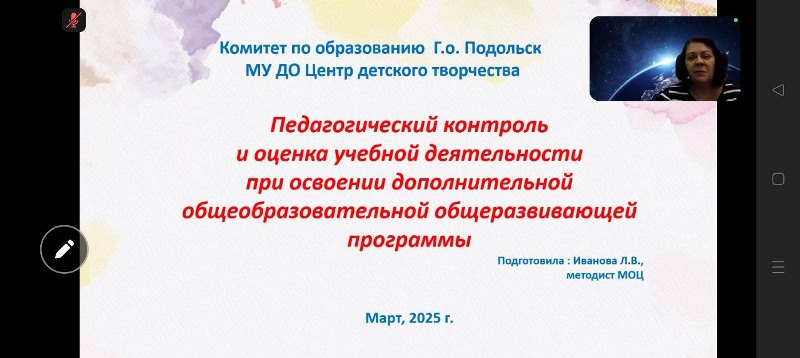 - «Педагогический контроль и оценка учебной деятельности при освоении дополнительной общеобразовательной общеразвивающей программы» (докладчик — методист Л.В. Иванова).