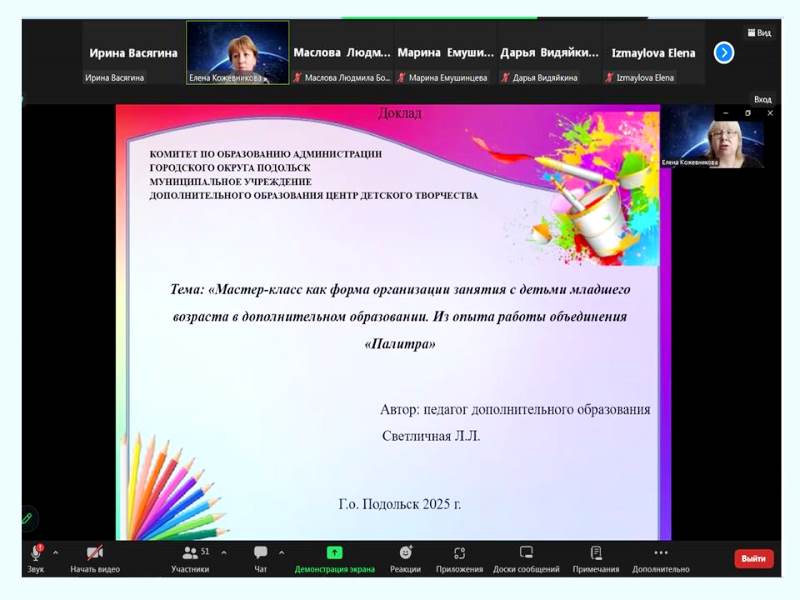— Л.Л. Светличная, педагог дополнительного образования МУ ДО ЦДТ (тема выступления: «Мастер-класс как форма организации занятия с детьми младшего возраста в дополнительном образовании. Из опыта работы объединения «Палитра» МУ ДО ЦДТ»)